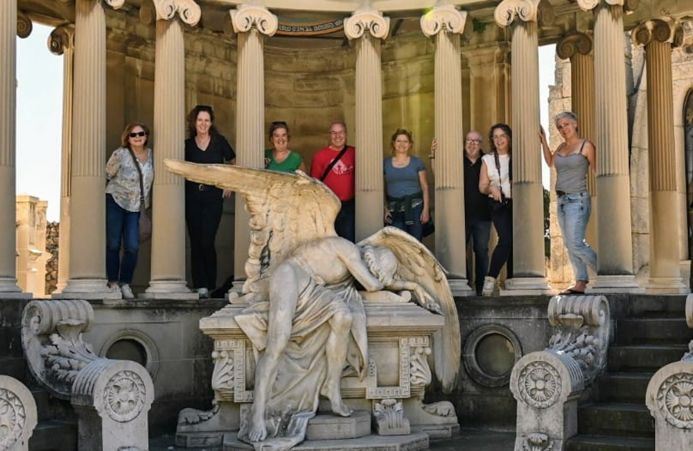 Ik zag ook de perfecte plek voor een groepsfoto – bij een neoklassiek tempelgraf, omringd door zuilen en een dramatisch treurende engel op een sarcofaag. Aan weerszijden trappen, dus het leek me niet kwetsend om daar gebruik van te maken.